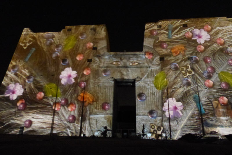Die Luft war zu dieser Nachtstunde noch mild. Die Innenhöfe der Tempel, ihre Fassaden und Säulengänge, waren mit farbigen Bildern angestrahlt und unterschiedlich beleuchtet. Da war einfach das große Staunen des Publikums angesagt. Erzählt wird die Geschichte des falkenköpfigen Horus, dem das Heiligtum am Nil geweiht war. Die gesamte Performance übrigens in deutscher Sprache war deshalb so faszinierend, weil die künstlerischen Motive der gezeigten Laser-Bilder in sehr kräftigen Farben mit der klug ausgewählten Musik, emotional vorgetragenen einfachen Worten und der imposanten Tempel-Architektur zu einer Einheit verschmolzen. Es wurde ohne jeglichen belehrenden Ton ein ganz besonderer Blick auf die ägyptische Geschichte, auf die Menschheitsgeschichte geboten. Und diese Geschichte erzählte von mächtigen Herrschern wie sie ihre Kriege führten und wieder Frieden schlossen.
