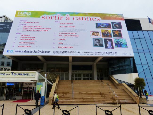 Das klotzige Palais des Festivals, 1979 als modernes Kongresszentrum mit 15 Sälen ausgebaut, hat nun selbst seine beigebraune Farbe mit allen möglichen modernen Strukturelementen und breit flächigen Werbepostern verdeckt, ein Sinnbild der prosperierenden Film- und Kongress-Industrie. Auch ohne Film-Diven und den roten Teppich ist die Show-Treppe an diesem geschäftigen Film-Bunker noch heiß begehrtes Foto-Motiv.