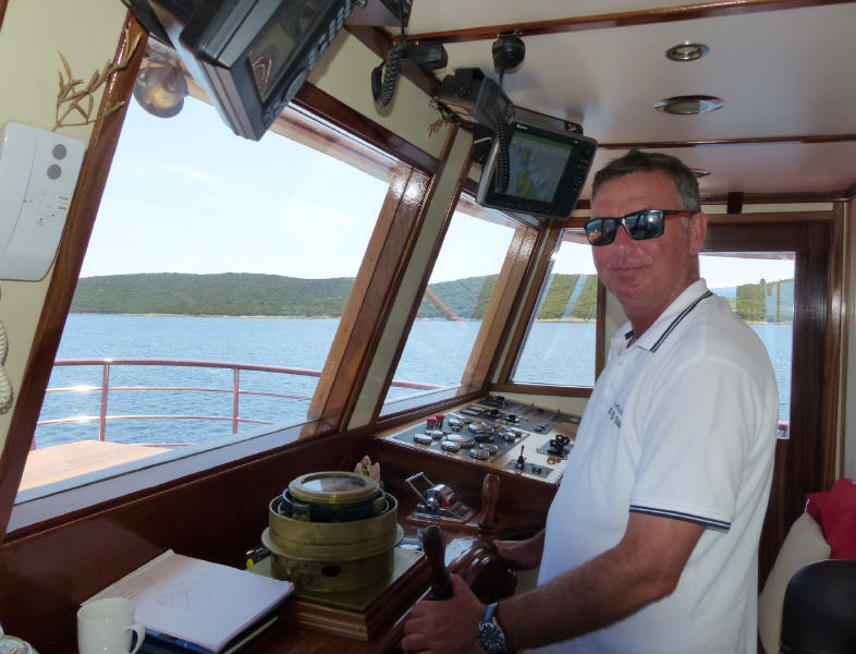 Kapitän Silvio Vukovic hat für seine Gäste die erste Bade-Bucht an der Insel Cres ausgesucht. Der Erste Offizier Slawen Cerni lässt laut rasselnd den Anker auf den Meeresgrund herunter. Ein dickes Tau wird am Ufer befestigt – eine zusätzliche Sicherheit für Schwimmer, die sich nicht so sicher fühlen.